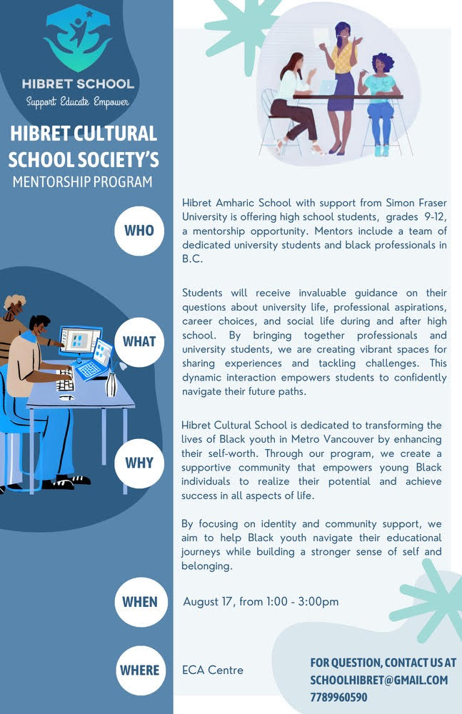 Hibret Cultural School Society ( HCSS ) proudly presents a special event tailored for black youth . Join us for an enriching mentorship event featuring Mentors from diverse backgrounds inspire and motivate these bright minds to dream big and achieve greatness.